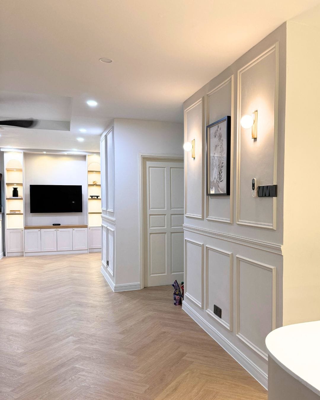 We transformed our client’s home by infusing modern English design, featuring classic elements like paneled walls, soft neutral tones, and rich textures, all elevated with sleek contemporary touches and aesthetics.